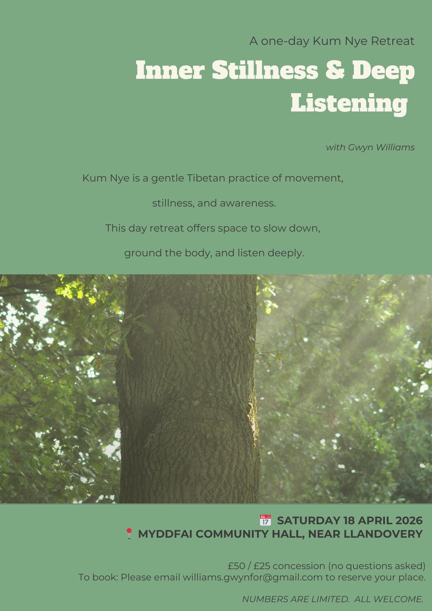On Saturday 18 April 2026, I’ll be leading a one-day Kum Nye retreat at Myddfai Community Hall, near Llandovery.